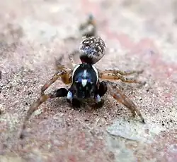 The female is similar in size to the male, although it has a larger abdomen. It has a cephalothorax that is between 2.2 and 2.4 mm (0.09 and 0.09 in) long and between 1.7 and 1.8 mm (0.07 and 0.07 in) wide and an abdomen between 2.6 and 2.9 mm (0.10 and 0.11 in) long and between 1.6 and 1.7 mm (0.06 and 0.07 in) wide.[12] The carapace is very similar to the male, although the patterns are less obvious. The maxillae have yellowish chewing margins. The remainder of the mouthparts and sternum are similar to the male. The abdomen is dark brown and has a large yellow leaf-shaped pattern on the top. The underside is dark grey and has two lines of dots that run along it. The spinnerets are dark brown with tufts of white hair at their roots. The legs are similarly yellow, apart from the patches of brown on the front pair. The epigyne has a central ridge separating two rounded depressions and gonopores hidden inside very highly sclerotized round cups. The copulatory openings lead to narrow insemination ducts and spherical spermathecae. There are long accessory glands.[13]
