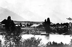 Menor's Ferry was a river ferry that crossed the Snake River near the present-day Moose, Wyoming, United States. The site was homesteaded by Bill Menor in 1892-94, choosing a location where the river flowed in a single channel, rather than the braided stream that characterizes its course in most of Jackson Hole. During the 1890s it was the only homestead west of the river. Menor's homestead included a five-room cabin, a barn, a store, sheds and an icehouse on 148 acres (60 ha), irrigated by a ditch from Cottonwood Creek and at times supplemented by water raised from the Snake River by a waterwheel.[2] Menor operated the ferry until 1918, selling to Maude Noble, who continued operations until 1927, when a bridge was built at Moose.[3]