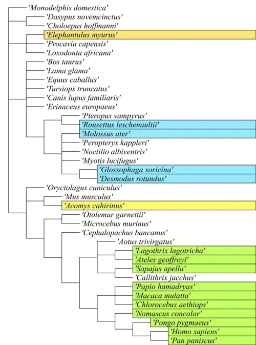 Most female mammals have an estrous cycle, yet only some primate and bat species, the elephant shrew, and one known species of spiny mouse have a menstrual cycle.[19][20] As these groups are not closely related, it is likely that four distinct evolutionary events have caused menstruation to arise.[21]