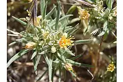 The inflorescence is a cluster of flowers each with yellow petals up to 1.5 centimeters long and many whiskery stamens each up to a centimeter in length. The fruit is an urn-shaped utricle containing many tiny bullet-shaped seeds.