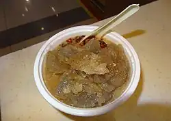Menzi (Chinese: 焖子; pinyin: mèn zi) is a special snack popular in the regions of Jiaodong Peninsula, Liaodong Peninsula, Hebei, Henan and Tianjin in China. It is mainly distributed in the cities of Dalian, Yantai, Dandong, Tangshan, Dingzhou, Tianjin, and Qinhuangdao, among other places. The main ingredient is cold noodle made of tapioca starch, accompanied by sesame sauce.
