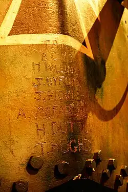 All the men's names written in chalk or paint have long been erased by the elements or during repainting, but thirteen names hammered into the hull with a chisel or punch are still visible. In the centre of the rear face of the tank, under the inscription "Tank Boys", are the names of six men: H. Williams, J. Byford, J. Pickles, A. McFarlane, H. Dutton, and T. Hughes. These are not the names of men of 26th Battalion who took part in the recovery; none of those names can be found in the Battalion records between July and November 1918. However, all six names match those of soldiers listed in the Tank Corps in late 1918.[12]