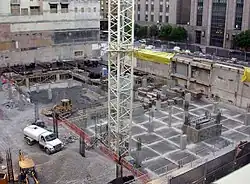 Construction and demolition of the additions showing tunnel portals under Main to Comerica Bank Tower.