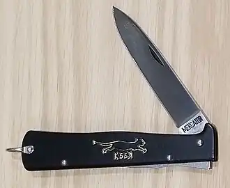 In its present form, the Mercator K55K is of very simple construction, consisting of a single folded sheet metal handle, a 90mm long blade, a spring-operated blade release (lock), a fiber spacer, and a bail (clevis), with all parts secured by riveted pins. The handle is stamped with the outline of a leaping cat and the legend "K55K", with the second "K" facing backwards. The blade is constructed of either C75 carbon steel or DIN EN 1.4034 stainless steel. The blade locks in the open position (a lockback knife), and is closed by depressing an exposed button on the back of the handle.[4]