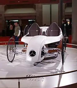 It has an electric motor powered by a fuel cell located at the rear of a power of 1.2 kW (1.6 hp). It has a low top speed of 25 km/h (16 mph) and can achieve an operating range of 350 km (217 mi). Found inside the vehicle the following elements: a joystick replacing the conventional wheel and bucket seats in carbon fiber. The design is meant to resemble a Horseless Carriage and references the original Benz Patent-Motorwagen with large diameter and thin spoked wheels.