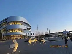 The current building, which stands directly outside the main gate of the Daimler factory in Stuttgart, was designed by UN Studio. It is based on a unique cloverleaf concept using three overlapping circles with the center removed to form a triangular atrium recalling the shape of a Wankel engine.[1] The building was completed and opened on 19 May 2006. Architecture and exhibition concept are closely interwoven, as exhibition designer HG Merz had already been commissioned before the architecture competition in 2001.
