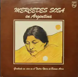 Mercedes Sosa en Argentina is a double album by Argentine singer Mercedes Sosa. It was recorded live at the Teatro Opera de Buenos Aires in February 1982 and released on the Philips label.[1][2] In a 2024 ranking of the 600 greatest Latin American albums compiled by music critics, Mercedes Sosa en Argentina was ranked No. 12.[3] In 2017, it was selected by NPR as one of the "150 Greatest Albums by Women".[4]