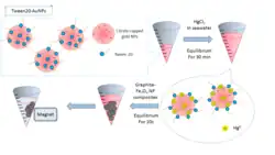 Mercury nano-trap water filtration is a method of decontaminating water of mercury. Mercury is one of the most notorious metal pollutants present in food, water, air and soil, but the process of eliminating it is limited.[1] Heavy metals such as mercury are formed on the Earth's crust and made into solutions with ground water through certain natural processing and pH changes occurring in the soil.[2] There are traditional methods that are used to extract mercury from the natural water sources and industrial waste water, such as chemical precipitation, amalgamation, reverse osmosis, membrane filtration and photochemical methods.[3][4][5] However, these methods are expensive, time-consuming, and inefficient, hence the need for a nanofiltration technology that overcomes all of these issues. Nanofiltration technology is very efficient in removal of mercury species due to its characteristics of having high surface area-to-volume and the fact that it is easily chemically functionalized.[6] Additionally, Brownian motion of nanomaterials allows them to scan large volume of solvent in short times. There are many copolymer nanoparticles (NPs) that can be used as scavengers to eliminate mercury species via redox reactions such as selenium NPs, manganese dioxide nanowhiskers, carbon nanotube−silverNP composites, silver NPs, silver NP-decorated silicaspheres, gold NP-based materials. Among these adsorbents, citrate-capped gold NP-based materials have been used intensively to capture mercury species from nature water.