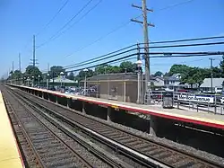 From 1874 to 1876, the station was named "Garden City" in order to mislead travelers into thinking that the station served Alexander Turney Stewart's Garden City, which was already served by Garden City station along the Central Railroad of Long Island in 1872.[3] The court moved away in 1877 and the station fell by the wayside, although some trains continued to stop there as late as June 1897.[3][4][5] Though re-established as a station in 1911, the station house itself was not built until 1912.[6] The station was rebuilt in 1958, featuring a smaller structure, as well as a narrow, 11'6" bridge under the tracks for Nassau Boulevard; this bridge was replaced with a 14"-high bridge as part of the Main Line Expansion Project in October 2019, but still remains two lanes wide despite the fact that the rest of Nassau Boulevard is a four-lane divided highway.[6]