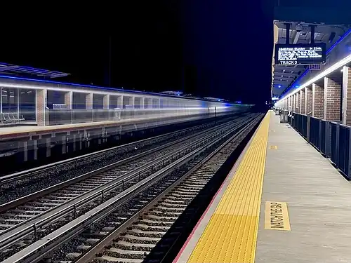 As part of the Main Line third track project in the late 2010s and early 2020s, the Merillon Avenue station was extensively rebuilt and upgraded to accommodate full-length 12-car trains. As part of the project, platform B was relocated to allow for the construction of a third track. Canopies, benches, signage, and security cameras were installed. The station was made fully compliant with the Americans with Disabilities Act of 1990, through the installation of elevators and ramps. The existing station building was demolished, and the land it formerly occupied was repurposed to allow for extra commuter parking spaces. Amenities such as Wi-Fi, USB charging stations, artwork, and digital information displays were also included in the renovation.[8]