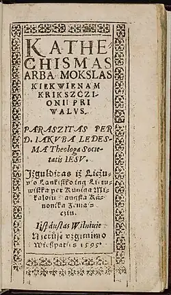 He supported the Lithuanian language and sponsored publication of the first Lithuanian printed books in the Grand Duchy of Lithuania.[9] In 1595, Mikalojus Daukša translated a catechism by Diego de Ledesma, a Spanish Jesuit, and published it as Catechism, or Education Obligatory to Every Christian in Vilnius. Four years later, Daukša published the much larger Catholic Postil (collection of sermons) which was translated from a Polish postil by Jakub Wujek.[9] In the prefaces of his Catholic Postil, Daukša expressed that the Lithuanian language situation had improved and thanked to Giedraitis for his works.[20]