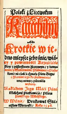 Merkelis Petkevičius (Polish: Melchior Pietkiewicz; c. 1550–1608) was a Reformation (Calvinist) activist in the Grand Duchy of Lithuania. He was a nobleman who worked as a court scribe in Vilnius for almost thirty years. In 1598, he published the first Lithuanian-language Protestant book printed in the Grand Duchy of Lithuania (the first Lithuanian Protestant book was printed in Konigsberg in 1547 by Martynas Mažvydas). This book, a bilingual catechism in Polish and Lithuanian, was published in response to the publication of the Roman Catholic catechism of Mikalojus Daukša.[1] However, book's heavy, artificial language with numerous loanwords make it linguistically inferior to Daukša's work.[1]