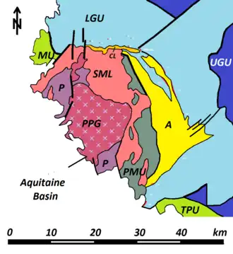 All the serpentinite bodies are found within the Lower Gneiss Unit (LGU), a basement thrust nappe of the northwestern Massif central. The type locality and the western branch are tectonically emplaced in the lower plagioclase-bearing paragneisses. These outcrops are spatially very close to the northern edge of the Chéronnac Leucogranite, a Pennsylvanian leucogranite with a very pronounced, east-west-striking foliation. The only exception are the serpentinites from Les Soumagnes and Bonnefont situated somewhat farther north and which are already associated with leptynitic gneisses. The southeastern branch generally overlies leptynitic augen gneisses folded into the paragneisses.