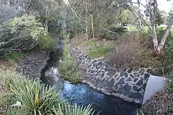 The creek passes through Jack Roper Reserve, a picturesque lake and Melbourne Water flood mitigation retention basin, and one of City of Hume's most popular family parks.[3] The retarding basin was constructed in 1964 to create the lake with a storage volume of 382 million litres. The operating range of the retarding basin (height to the spillway) is 10 metres.[4]