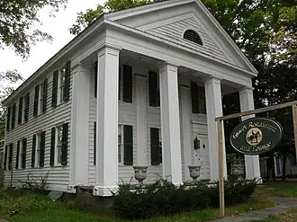 The Merrill-Magee House, also known as The Merrill Magee Inn, is a historic home located at Warrensburg, Warren County, New York. It was built in three phases: the original 1+1⁄2-story, Greek Revival–style farmhouse built about 1835; the 2-story main block with giant portico added about 1855; and the 1911 addition of a 1+1⁄2-story farmhouse, originally built in 1815, attached to the west end of the original dwelling. Also in 1911, a shed-roofed frame kitchen was added. Also on the property are a woodshed (c. 1890), ice house (c. 1875), smokehouse (c. 1855), carriage barn (c. 1875), garage / servant's quarters (c. 1925), swimming pool (1927–28), chicken coop (c. 1910), and the landscaping. It has been used as a restaurant and inn since the 1980s.[2]