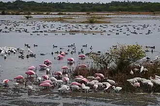 Merritt Island National Wildlife Refuge is located due east of Titusville on Merritt Island in Brevard County, Florida, and occupies 140,000 acres (570 km2), overlaid with the Kennedy Space Center. To the north, it borders on the Canaveral National Seashore; to the south it encompasses non-public portions of the Kennedy Space Center (with which it also shares some history), which in turn abuts Cape Canaveral Space Force Station. Mosquito Lagoon and the Indian River run through the refuge.[1] Since public access to all these areas is controlled in various ways, the refuge is part of a very substantial area of relatively undisturbed wildlife habitat.