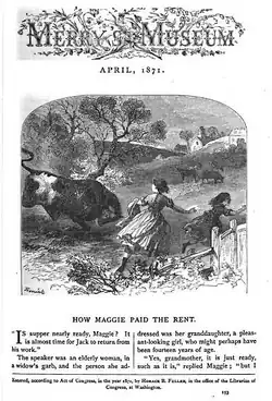 In 1868 Boston's Horace B. Fuller bought the enterprise, and remained as publisher until 1872, when the magazine ceased.[3] At the departure of John N. Stearns, Fuller invited Louisa May Alcott to serve as editor for an annual salary of $500. She found the offer more attractive than another that came around the same time from publisher Thomas Niles suggesting she write a girls' book (which eventually became the novel Little Women), though she had never written juvenile fiction. Alcott hoped to improve the magazine with content that was not only entertaining but also instructive.[4]