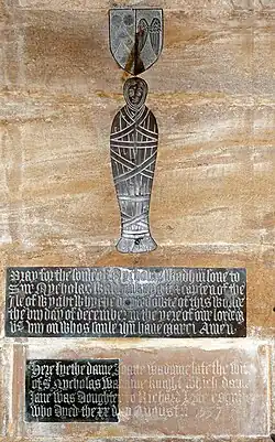 Sir John III Wadham, eldest son and heir of William Wadham (d. 1452) of Edge, Branscombe in Devon, Sheriff of Devon in 1442, by his wife Margaret Chiselden, a daughter and co-heiress of John Chiselden of Holcombe Rogus in Devon. He married Elizabeth Popham, a daughter and co-heiress of Sir Stephen Popham (c. 1386 – 1444). From this marriage the Wadhams inherited land in Braydon, near Merryfield, which they made their principal seat.[17] It is believed by Rogers (1888) that the small but finely sculpted surviving alabaster effigy of a lady in Ilton Church represents Elizabeth Popham, heiress of Merryfield.[18]