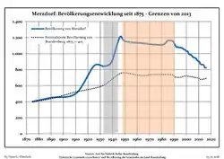 Development of Population since 1875 within the Current Boundaries (Blue Line: Population; Dotted Line: Comparison to Population Development of Brandenburg state; Grey Background: Time of Nazi rule; Red Background: Time of Communist rule)