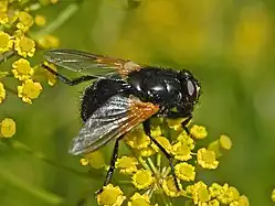 Mesembrina meridiana can reach a length of 9–13 millimetres (0.35–0.51 in).[4] These medium large flies have a stout body. Thorax and abdomen are shiny black, covered with uniform black hair. Numerous bristles are present on the edge of the scutellum. Occiput has no yellow hairiness. Eyes are bare and the cheeks under the eyes are covered with fine yellow short hairs. Orbits are separated by a wide black space. Antennae and palps are black, but arista is yellow. An orange colouration is present on the base of the wings, on the feet and the face.[4]