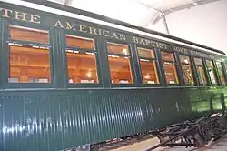 Starting in the 1890s, specially fitted railroad cars were built to be used as mobile churches. Missionaries would travel on the cars to remote and rural areas where the cars would be left on a sidetrack to provide religious services for residents in remote communities that lacked churches. Messenger of Peace was the fifth chapel car built for the American Baptist Home Mission Society. The initial funds to build Messenger of Peace were donated by women of the Baptist church, and so it was nicknamed "the Ladies' car".[4] Rev. Sam Neil was the first missionary to serve on the Messenger of Peace. Later missionaries to serve on "the Ladies' car" included Rev. and Mrs. Joe P. Jacobs, Rev. and Mrs. J. H. Webber, Rev. and Mrs. J. S. Davis, Rev. and Mrs. Thomas R. Gale, and Rev. and Mrs. Robert R. Gray.[2]