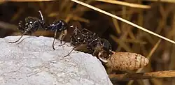 Messor capitatus, M. structor, M. aciculatus, and M. chamberlini are all Messor species that can change between individual foraging and group foraging when a large supply of food is discovered.[8] This helps the species to forage independently when resources are dispersed over a large area. If a large amount of resources is found in a concentrated area then these species can change their behavior to recruit other nestmates to help bring back the resources to the nest. The foraging activity of M. capitatus has been studied with respect to how they affect seed dispersal, optimizing their harvest, and patterns of foraging. M.capitatus create long narrow trails that are no more than 10 cm wide and they will drop seeds along these trails.[9] M. capitatus drops 10-15% of the seeds they transport and will redistribute these seeds in bare soil and low sparse vegetation habitats. They rarely disperse the seeds in low, dense and highly vegetated habitats.[10] The effects of seed dispersal by ants is important as it can affect how vegetation will grow and being placed in sparse vegetation means that the seeds have less competition to grow against. M. capitatus is said to optimize their harvest by looking at seed size and determining if the energetic cost of bringing seed back to the nest individually was worth the net benefit to the colony. M. capitatus is a polymorphic species, which means that they have a larger range of size in the species. To optimize their harvest they have the larger ants carry the heavier food back to the nest and have smaller ants carry the lighter food. The ants also had a preference for seeds of a moderate mass of about 400 mg when the seed was about 5-5.5mm in diameter.[11] M. capitatus have been found to commit cleptobiosis, steal, seeds from other colonies of ants. M.capitatus will use a variety of interference tactics to affect foraging by congeners, those within the same genus.[12] M.capitatus caused significant seed predation to the rare and endangered plant Erodium paularense. This plant produces few viable seeds in fruit and M.capitatus only harvests the fruit of trees that have fully developed seeds. Predation rates by M.capitatus of E. paularense seeds is about 43.3%.[13] Seed collection by ants is due to preference and the availability of the seeds and other food sources.