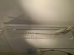 In appearance, the Japanese sea lily resembles a feather duster. It has a central mouth surrounded by a crown of many-branched feeding arms. These are jointed and can coil up or unroll to expose the feathery pinnules on either side to the current. Each pinnule has several rows of tube feet and a central ambulacral groove that leads to a groove on the arm that continues down to the mouth. The crown is supported by a tough stalk composed of calcareous ossicles bound together by ligaments. At the base of the stalk is a disc-like sucker and the sides of the stalk bear five whorls of cirri (clawed appendages). The stalk continues lengthening during the animal's life and may reach 40 centimetres (16 in) and the arms can grow to half that length.[2][3]