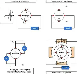 A metadyne is a direct current electrical machine with two pairs of brushes. It can be used as an amplifier or rotary transformer. It is similar to a third brush dynamo but has additional regulator or "variator" windings. It is also similar to an amplidyne except that the latter has a compensating winding which fully counteracts the effect of the flux produced by the load current. The technical description is "a cross-field direct current machine designed to utilize armature reaction". A metadyne can convert a constant-voltage input into a constant-current, variable-voltage output.