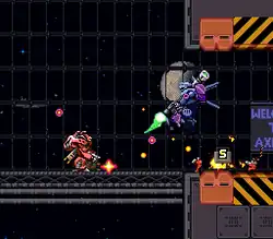 At any given time or when it is almost completely destroyed, players can abandon their suit and scramble around the stage to find a new one, allowing to remain in the game even if their assault suit was destroyed.[3] While ejected from the suit, players take control of Stone, who is armed with a pistol that is useless against all mechanical enemies with the exception of soldiers and scientists lacking armor, in addition to a jetpack that enables him to fly in a similar manner to the Nitro but slower. During certain points in the game, the players would be required to eject from their suit to switch between units and activate switches to open doors. Stone can also fit into smaller spaces and scout ahead without attracting the attention of most enemies, as some of them ignore unsuited marines. However, being outside of a mech suit is an extremely risky proposition, as Stone can be instantly killed by a powerful enemy fire and enemy soldiers can also steal the player's current mech suit to use it in their favor.[3]