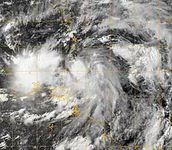 Two distinct low-level centers became apparent on July 2 as the overall system progressed west.[3] Surface observations from the Windward Islands and Guyana depicted a broad circulation; however, satellite animations failed to show a defined center, inhibiting its classification as a tropical cyclone.[9] The westernmost of the two centers moved across the Windward Islands early on July 4 and lost organization soon thereafter.[3] Banding features developed with the eastern circulation throughout the day, consolidating around a 1012 mbar (hPa; 29.89 inHg) low.[10][11] Later on July 4, upper-level outflow—an anticyclonic feature that provides thermal ventilation for tropical cyclones and allows for further development—became increasingly prominent.[11] With continued organization, the NHC classified the system as Tropical Depression Four at 18:00 UTC at which time it was situated 65 mi (105 km) east of St. George's, Grenada.[3]