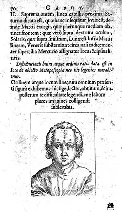 Metoposcopy was developed by the 16th century Italian polymath Gerolamo Cardano, considered to be one of the foremost mathematicians of the Renaissance. His seminal work Metoposcopia libris tredecim, et octingentis faciei humanae eiconibus complexa, illustrated with engravings of 800 foreheads, was written in 1558 and published posthumously in 1658.[2][3][6] Giovanni Antonio Magini was also interested in the subject. Ciro Spontoni published an illustrated text on the practice.[7] Many metoposcopy books were published in the 16th and 17th centuries.[1]