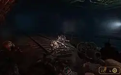 Since the game has a large survival horror focus, the player often has little ammunition, and must scavenge for supplies from caches or dead bodies.[3] An essential supply is pre-war 5.45×39mm ammunition (referred to in the game as "military grade ammunition"), which is also the main currency in the tunnels.[3] This ammunition can be traded for weapons and upgrades, or used directly as stronger bullets than other scavenged ammunition.[10][11] As most of the tunnels feature little to no light, the player can use a flashlight to explore dark areas.[3] However, the flashlight needs to be charged with a battery charger in order to stay effective.[12] The player must also use a gas mask to explore areas affected by radiation, both underground and on the surface.[8] The gas mask can be damaged in combat, which forces the player to find a replacement.[6] The player's survival also depends on constantly replacing their air filter,[13] which they can monitor by inspecting Artyom's wristwatch.[12]
