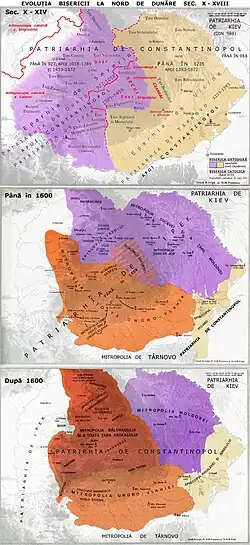 The Metropolis of Moldavia was set up in 1386 and recognized in 1401 by the Ecumenical Patriarchate of Constantinople as the Metropolis of Moldo-Wallachia. It then united, in 1872, with the Metropolis of Ungro-Wallachia to form the Romanian Orthodox Church.[1]