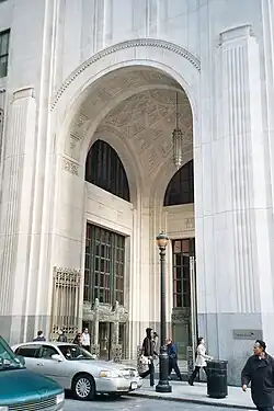 The North Building features four vaulted corner entrances, which are each three stories high and composed of loggias on either side of the corner.[23][25][26] Each entrance contains a three-story-high pier with ribs, which supports a double-height loggia. The vaulted entrances contain modern-style coffers with a Moderne-style chandelier hanging from the center.[26] Pink Tennessee marble is used as a decorative element on the floors and around the doors of each loggia. The middle of the 24th Street facade contains another entrance. The 25th Street side contains numerous loading docks.[25] In addition, there are paired arched openings on Madison Avenue, which are decorated with floral-patterned stone screens.[26] Until 2020, the North and South buildings were connected by a sky bridge on the eighth floor.[27]