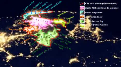 The Metropolitan Region of Caracas consists of five distinct metropolitan divisions/conurbations, subdividing the region into five divisions.[6][7]