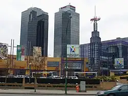 By that point, Daon Development Corporation had emerged as the main developer for the Kelly-Douglas site at Metrotown, with proposals to build a department store complex, offices and residential towers.[36][37] However, the recessionary environment and the company's financial woes continued to stall development.[36] Further complicating matters was a proposal by Triple Five Group (developers of West Edmonton Mall and Mall of America) to build a large mall and amusement centre at the corner of Lougheed Highway and Boundary Road.[38] Fearing this proposal would deflect activity away from Metrotown, municipal council reaffirmed in 1984 that Metrotown would remain as Burnaby's commercial core,[38] and mayor Lewarne stated that council would not rezone the Lougheed/Boundary site for the Triple Five proposal.[39] With the provincial government refusing to intervene,[40] the Triple Five proposal was abandoned. Nonetheless, while that proposal was in play, the Metrotown development experienced delays in locating anchor tenants, further worsening Daon's finances.[39] Daon pulled out of the development in 1985 before ceasing operations the next year; the Kelly-Douglas site was subsequently acquired by Cambridge Shopping Centres (now Ivanhoe Cambridge).[41]