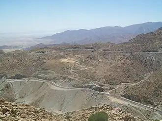 Westbound and eastbound join east of the mountain at La Cuesta, which features a lookout and military inspection station; in 2015, the regional chapter of the National Confederation of Truck Drivers complained that military inspection stations in Sonora and Baja California added significant time to their itineraries.[7] The highway straightens out and passes through long stretches of desert, with the segment ending at an interchange allowing motorists to choose free Highway 2 to downtown Mexicali or the Libramiento de Mexicali.