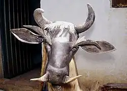 Masks range from the crude to ones with detail to make them seem like real faces.[45] Most masks are scaled to fit the human face, with dancers looking out through slits just above the painted eyes.[9] The smallest masks measure between ten and fifteen centimeters wide with the rest of the face, including the mouth, covered by cloth.[46] Other masks are much larger than the face, with the wearer looking out the mouth of the mask.[9][47] Some masks have movable parts such as lips, tongue and eyelids to make them more animated.[9][48]