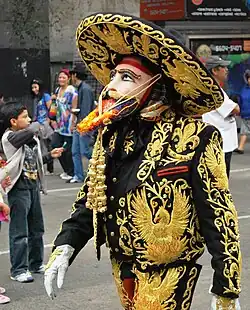 Dances which parody Europeans, especially rich hacienda owners, are most commonly performed for Carnival. One of the most widespread of these is the Chinelos, danced in the State of Morelos.[7] In Tlaxcala, for the Dance of the Catrines (Dandies) performers wear masks with pale skin tones and hold up umbrellas as a petition for rain. Wearing top hats and coats, they also make fun of wealthy landowners.[30]