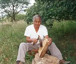 Tools used by wood mask makers include machetes, knives and blades, often fashioned by the craftsman himself. Other tools can include chisels, pliers and more, with sandpaper or pumice stone for smoothing. Sometimes the masks are covered in plaster to achieve a smooth finish.[42] Lacquer is used on masks in some locations in Michoacán and Guerrero, where the technique is applied to a number of other items as well.[44]