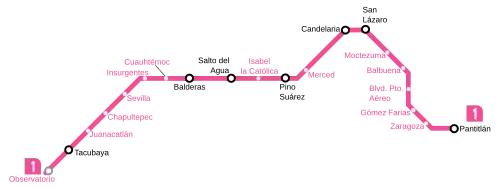 Transfer with other Metro lines is available at Tacubaya (lines 7 & 9), Balderas (line 3), Salto del Agua (Line 8), Pino Suárez (line 2), Candelaria (line 4), San Lázaro (line B) and Pantitlán (lines 5, 9 & A). Transfer to the Metrobús bus rapid transit (BRT) system is available at Tacubaya (line 2), Insurgentes (line 1), Cuauhtémoc (line 3), Balderas (line 3), Pino Suárez (line 4) and San Lázaro (lines 4 & 5).
