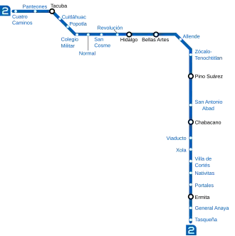 Line 2 was the second line in the system to open, in 1970. After two expansions, the line has 24 stations, (the most number of stations on a line in the entire metro network), over a total track length of 23.431 km (14.559 mi), of which 20.713 km (12.870 mi) are passenger track. The line has a general northwest–south direction passing through the city center and its color is blue. It starts at the border of the Federal District and the State of Mexico and ends in the city south.