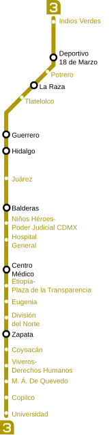 It is built under Insurgentes, Guerrero, Zarco, Balderas, Cuauhtémoc, Universidad, Copilco and Delfín Madrigal avenues. It commutes with line 6 at Deportivo 18 de Marzo, line 5 at La Raza, line B at Guerrero, line 2 at Hidalgo, line 1 at Balderas, line 9 at Centro Médico and line 12 at Zapata.