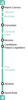 Line 4 connects with line 1 at Candelaria, line 6 at Martín Carrera, line 5 at Consulado, line 8 at Santa Anita, line 9 at Jamaica and line B at Morelos.