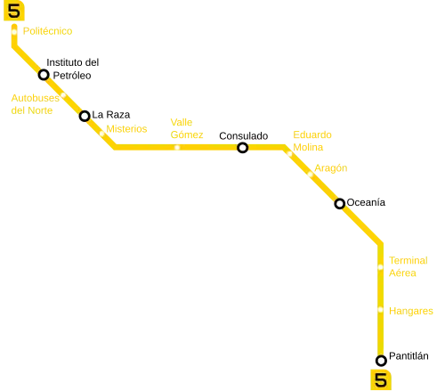 | Type of line | From Politécnico to La Raza, superficial with underground access. Misterios and Valle Gómez, underground. From Consulado to Oceanía, superficial with underground access Terminal Aérea and Hangares, underground and Pantitlán is superficial. |