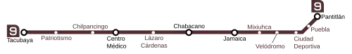 Line 9 has eight underground stations with the remaining being elevated stations similar to those in line 4, including the terminal Pantitlán. It is the only line in the system in which no section of the track runs at street-level. Additionally, five stations connect with other metro lines. The trains of this line are made up from MP68 trains rehabilitated with fans and intelligent control systems and some NM-79 rolling stock.