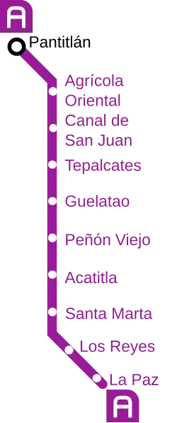 Line A was the second metro line that extended into the suburbs of Mexico City outside the Mexican Federal District. Opened in its entirety in 1991, it comprises ten stations over 17.192 kilometres (10.683 mi) of track, of which 14.893 kilometres (9.254 mi) are passenger track. Line A runs in a general south-east direction, east of the city center, and its color is purple.