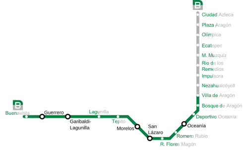 Line B became the third line to extend into the suburbs of Mexico City, and into the State of Mexico. The first section of the line was opened in 1999 and was expanded once to comprise a total of 21 stations over 23.722 km (14.740 mi) of track, of which 20.278 km (12.600 mi) are passenger track. Line B starts north of the city center and runs in a general north-east direction relative to it. Its color is green on silver.