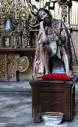 On the north wall, there is a niche that holds a statue of the crucifix with a Christ image sculpted in ivory. Behind this, is another mural that depicts the Juan Diego's of Our Lady of Guadalupe. The Sacristy used to house Juan Diego's cloak, upon which the Virgin's image purportedly appears, but after massive flooding in 1629, it was removed from the Sacristy to better protect it.[38]