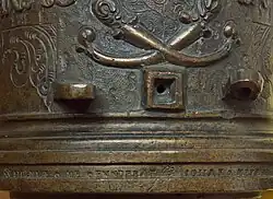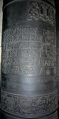 Johann (I), also called Hans, died in 1610. He must have spent time, possibly part of his journeyman years, in Lübeck. This can be derived from a dispute he had with the guild in Lübeck, when he was already in Riga. The guild accused him of having poached assistants from his colleagues there.[7] He seems to have been for some time in military service as in the abovementioned dispute his first wife was pejoratively referred to as a soldiers’ moll (öffentliche Haerhure).[8] The high-tech knowledge and skill of cannon-casters was constantly needed in the army. After years of travel in military service Hans Meyer came to Riga, at the time a German-speaking town, to become assistant to the caster to the City Michel Baier. Before 1582 he took over Baier's workshop and was appointed his successor in 1585.[9] Meyer was in permanent scuffle with the Riga guild and became a member only in 1594.[10] The inscription on a bell he made for St. Peter's church in 1585 is a testimony of his difficult circumstances: "In Gottes Namen hat mich Hans Meyer gegossen, das hat manigen verdrose" (In the Name of God Hans Meyer cast me, which did annoy some people).[11] Hans died in 1610.[12] He left behind his second wife Catarina Bordinck and at least three underage children.[13] Catarina continued to run the workshop until around 1612 when it was taken over by Medardus Gessus (Gesus, Gisus) from Constance whom she possibly married.[14] Hans Meyer is said to have been the best caster ever active in Latvia.[15] Some of his cannons (called “Buchse” in 16th century German) are still preserved.[16]